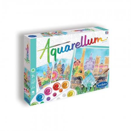 Moszkva, London, Párizs - 3 európai fővárost festhetünk meg az Aquarellum készlettel. A Sentosphere Aquarellum sorozata tökéletes azoknak a gyerekeknek, akik már gyakorlatot szereztek a színek keverésében az Aquarellum Mini sorozattal, de kezdő festőművészek is örömüket lelik benne. Az Aquarellum a velin papírra festés technikáján alapul: a velin nem szívja be a festéket, mint a porózus felületek. Mivel a 3 mellékelt kép körvonalai már meg vannak rajzolva, így a 9 színnel a csodálatos végeredmény garantált! A játék kiválóan fejleszti a kreativitást kézügyességet koncentrációt esztétikai érzéket. A készlet tartalma: 9 flakon akvarellfestéket tartalmazó paletta 1 db magas minőségű ecset 1 pipetta 3 részlegesen bevont kreppelt pergamen tábla 25 x 32,5 cm útmutató Hogyan készül: