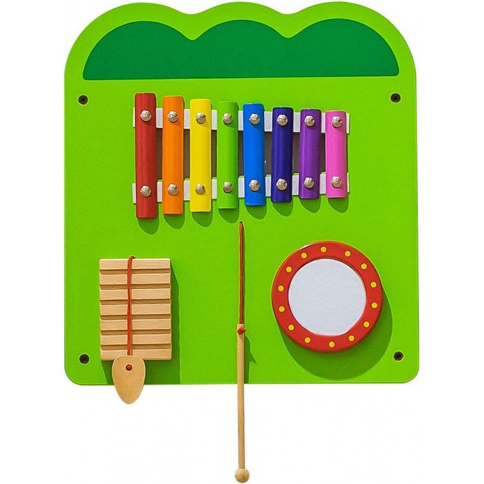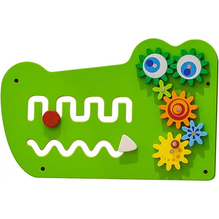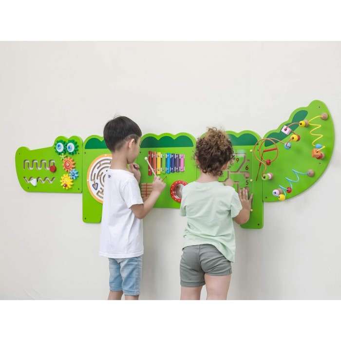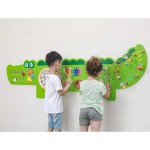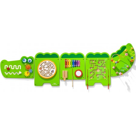 Összetett készségfejlesztő játék, matatófal (falra szerelhető, krokodil). Fejlesztőjáték, mely egyéni és csoportos foglalkozásra egyaránt alkalmas.