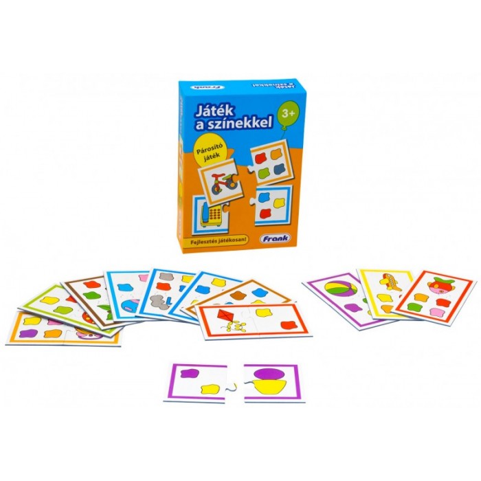 E párosító játék segít a gyermekeknek a színek felismerésében. A játék során a kicsik különféle élőlények és tárgyak rajzát párosíthatják össze az azokban előforduló színek képével. Ha a gyermek helyesen rakja össze a párokat, akkor a két kép pontosan illeszkedik egymáshoz, így a gyermek önmagát tudja ellenőrizni. Fejlesztési területek: - szem-kéz koordináció - finommotorika - színfelismerés - ismeretbővítés - szókincsbővítés Az alapjáték mellett számtalan más játéklehetőség rejlik ebben a puzzle-ban, pl. memória-, gyorsasági játék és barkochba. E tevékenységek további területek fejlesztésére nyújtanak lehetőséget.