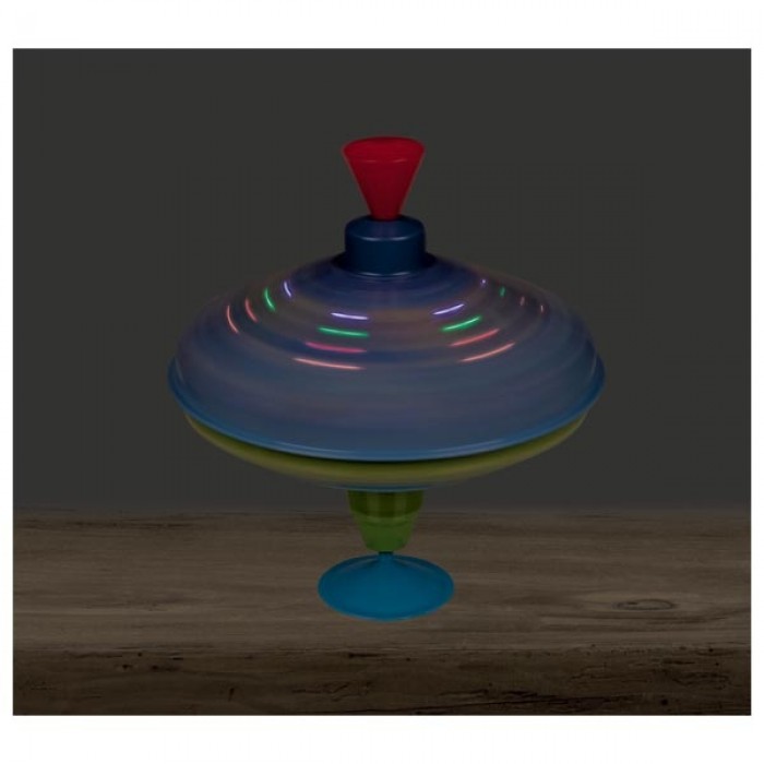 Fémtestű búgócsiga űrhajós mintával, melyet az különböztet meg a többitől, hogy LED izzókat is tartalmaz, amelyek a centrifugális erő hatására a forgási fázisban világítani kezdenek.