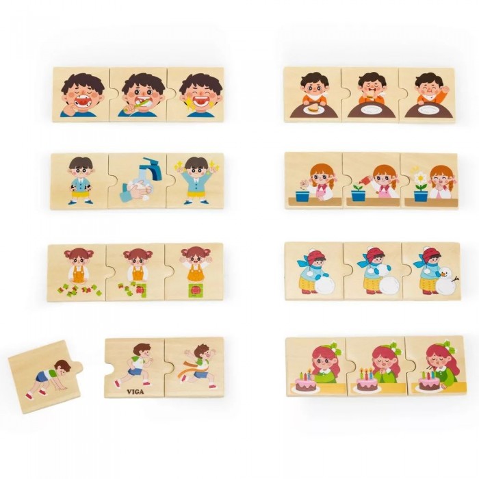 Segíthetünk a gyermekeknek megérteni a mindennapi tevékenységek sorrendjét, és fejleszthetjük logikai gondolkodásukat és történetmesélő képességeiket. Kiváló módszer a kisgyermekek új szókincsének, koncentrációs és finommotorikus képességeinek fejlesztésére, valamint asszociációk és kapcsolatok létrehozására. A logikai sorrendű tevékenységeket ábrázoló puzzle-készlet elsődleges funkciója nem csupán a tanulás. Támogatja továbbá: a figyelemkészséget, a koncentrációt, a finom motorikus képességeket és a vizuális koordinációt.