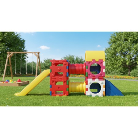 A készlet tartalma: 19 db lyukas oldalelem, 2 db létraelem, 2 db összekötő cső, 1 db tető, 1 darab 45 fokos mini csúszda és 1 db kétfunkciós elem.