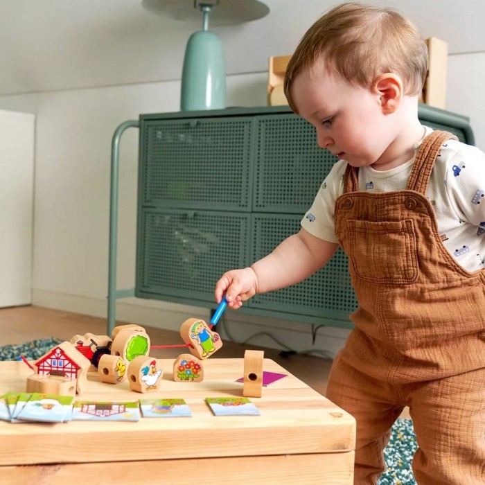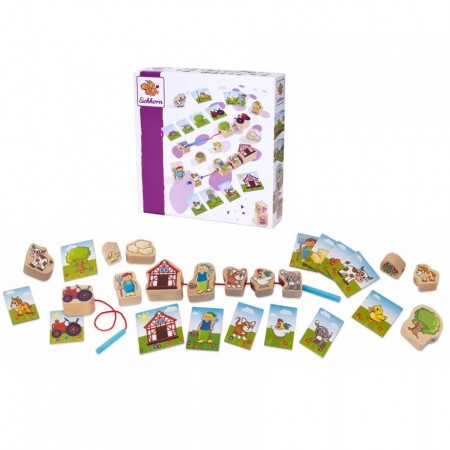 Ez a fűzős fajáték tökéletes választás a 2 éves kortól kezdve a finommotorika fejlesztésére és a szórakozásra egyaránt! Vidám farmállatokkal és tárgyakkal díszített fa elemekből áll, melyeket egy színes zsinórral lehet egymáshoz fűzni.